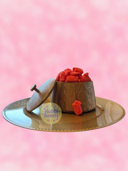 Glucosestroop, suiker, water, halal rundergelatine, gemodificeerd aardappelzetmeel, voedingszuren (E330, E270), pectine, kunstmatige smaak, kleurstoffen (E129, E163, E160a(i)).