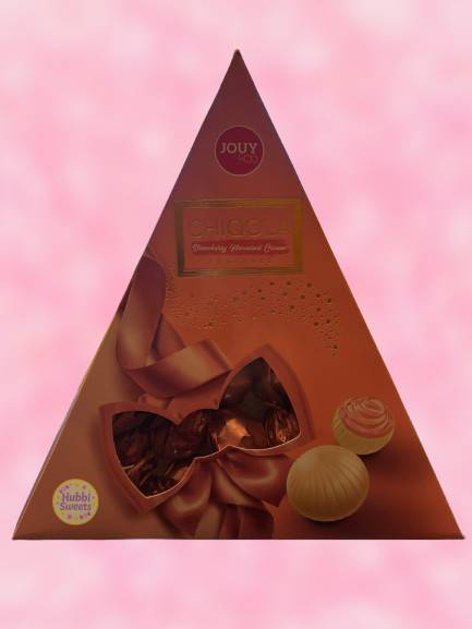 Witte compound chocolade met aardbeienvulling: suiker, plantaardige vetten (palm, palmpit, volledig gehydrogeneerd), weipoeder (melk), magere melkpoeder, lactose (melk), aardbeienpoeder, aroma’s (melk), emulgator: sojalecithine, mono- en diglyceriden van vetzuren, zuurteregelaar: citroenzuur, kleurstof: rode biet, zout.